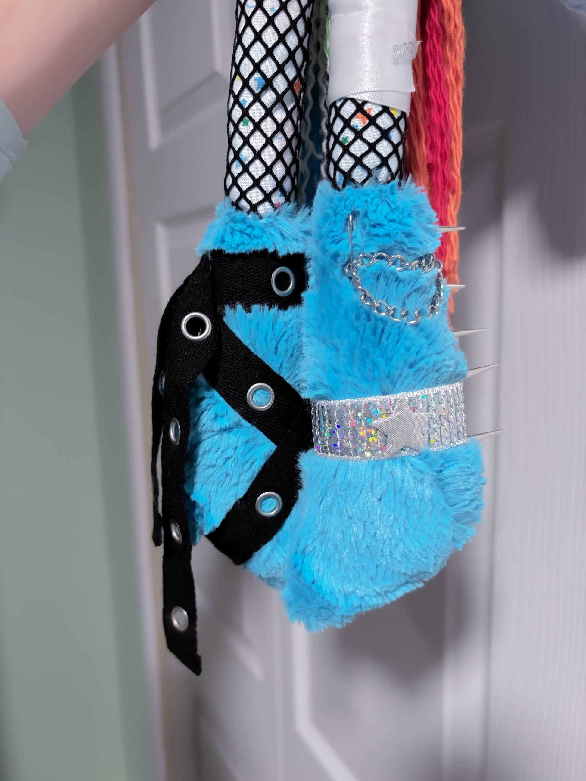 This cutie is 100% handmade by yours truly using faux fur fabric, cotton fabric, clay, paint, beads, and more! Filled with Glass beads for weight. Everything from the handsewn base, to the handsculpted and decorated face!