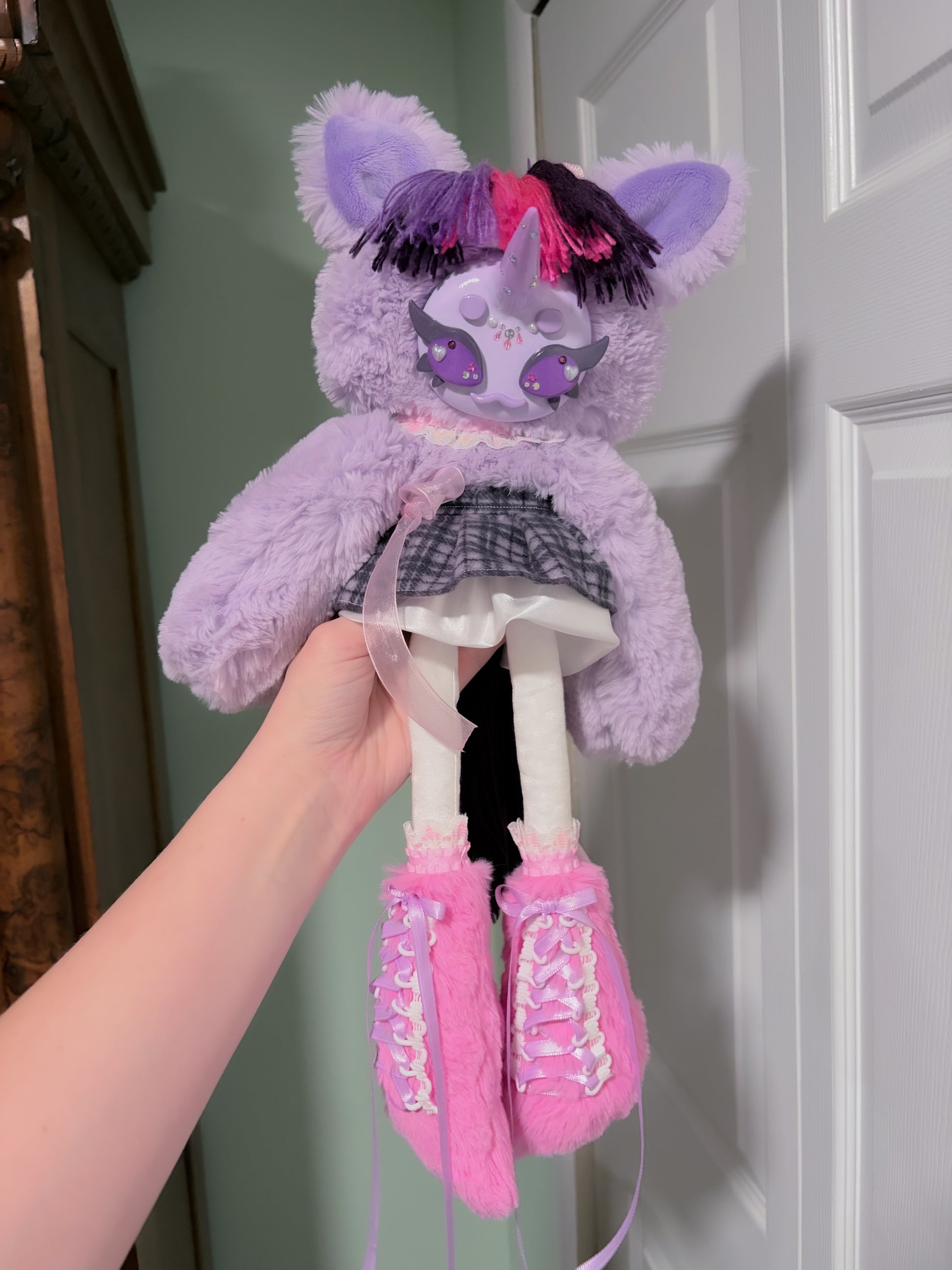 This cutie is 100% handmade by yours truly using faux fur fabric, cotton fabric, clay, paint, beads, and more! Filled with Glass beads for weight. Everything from the handsewn base, to the handsculpted and decorated face!